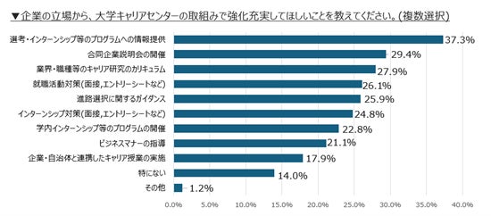 大学に対して、「企業の選考情報の提供(37.3%)」や「合同説明会の開催(29.4%)」といった、企業の採用に直結するような取り組みへの期待が高い一方、「業界・職種等のキャリア研究のカリキュラム(27.9%)」のような、学生の視野を広げる取り組みへの期待も高かった。