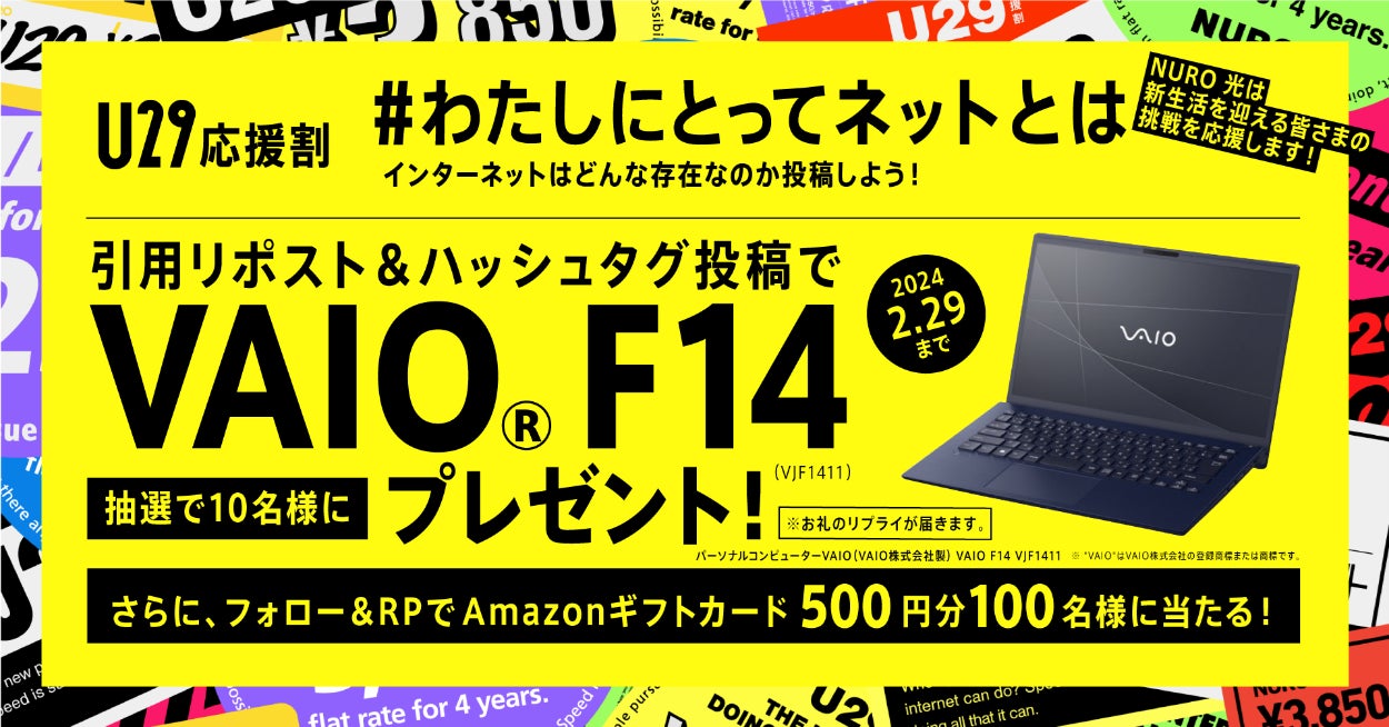 「NURO 光」の公式X(@NUROhikari_Sony)をフォローして対象のキャンペーン投稿をリポストした方の中から、抽選でAmazonギフトカード500円分をプレゼントします。さらに、引用リポストして指定のハッシュタグ「#わたしにとってネットとは」をつけて投稿した方の中から、抽選でパーソナルコンピューター VAIO® F14(VJF1411)をプレゼントします。
