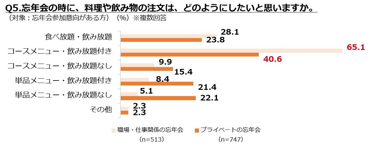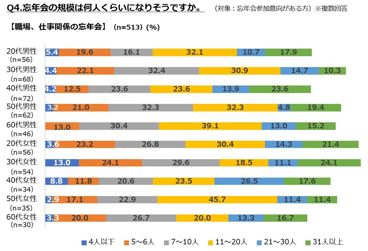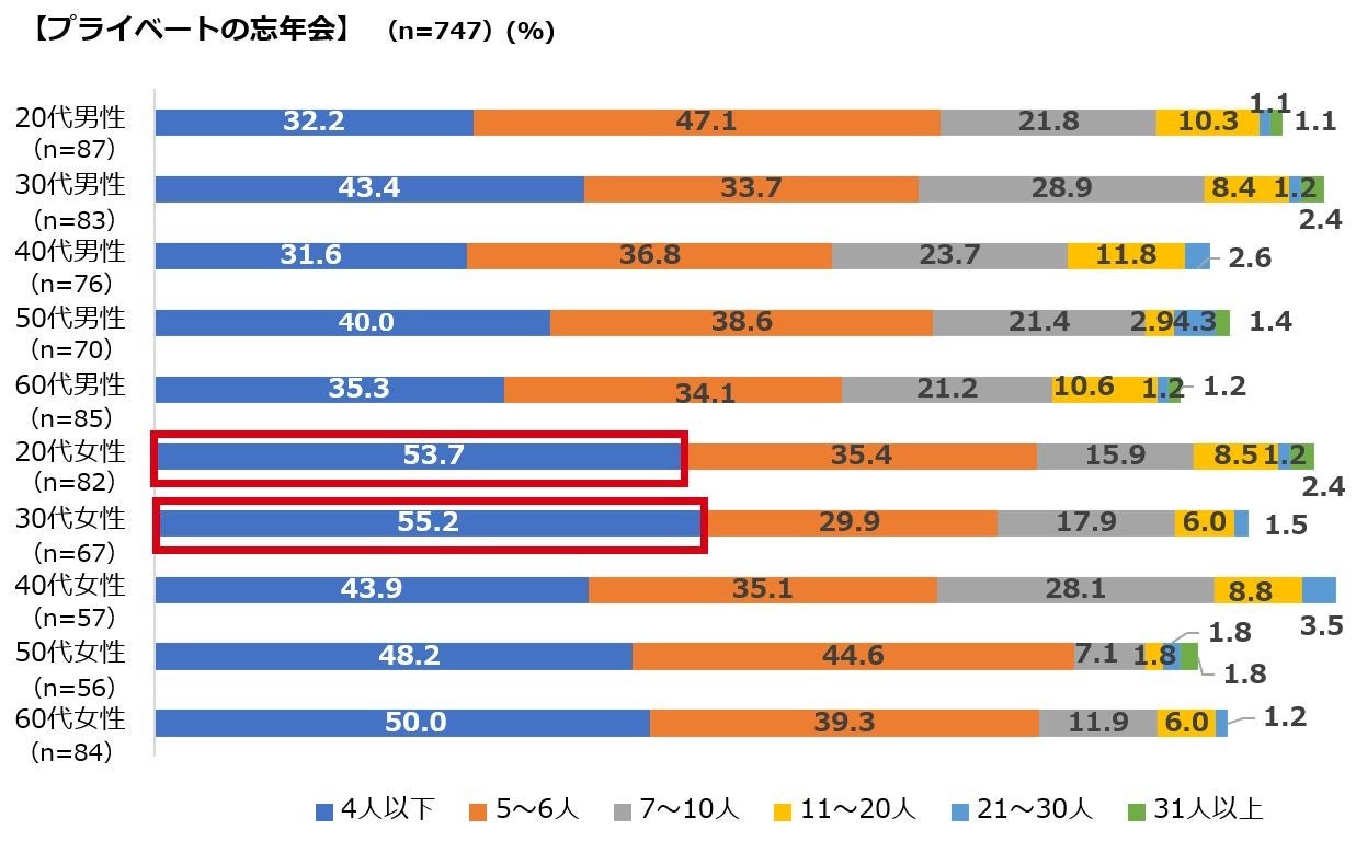 職場の忘年会は、中規模(11~20人)が中心で、コースメニューを選ぶ堅実なスタイルが主流です。一方で、プライベートの忘年会は、小規模(4人以下)が多く、単品メニューを利用する柔軟なスタイルも支持されています。
