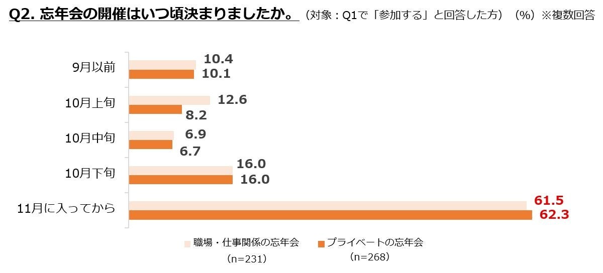 開催の決定時期は、職場・プライベートともに「11月以降」が6割以上を占め、準備期間は1か月程度が一般的なようです。
