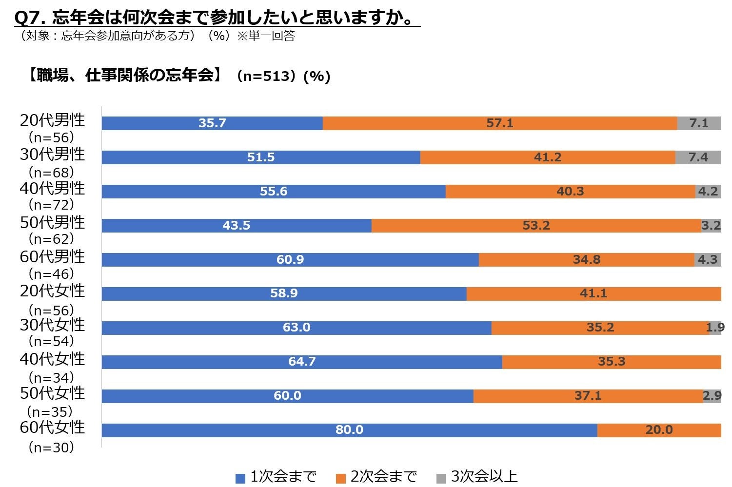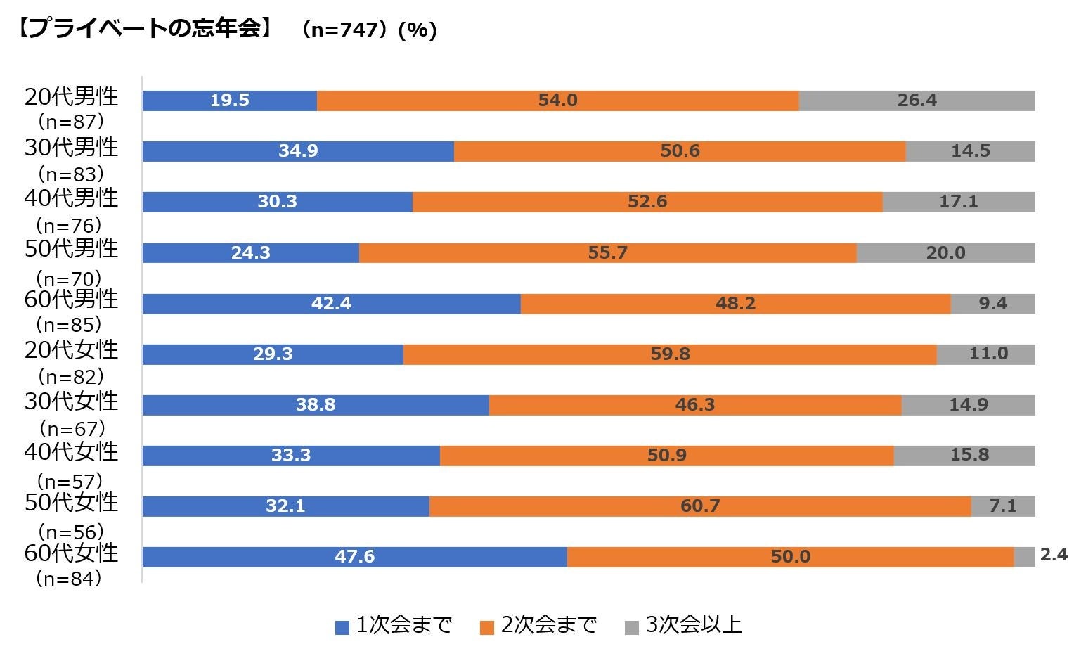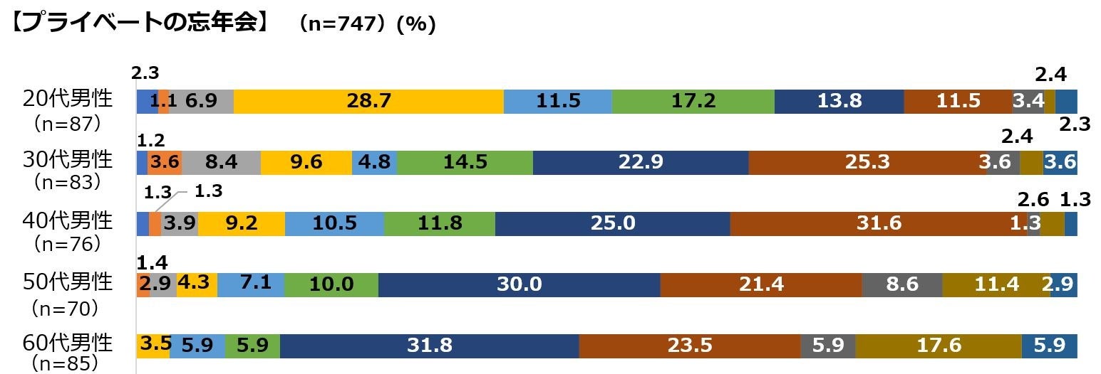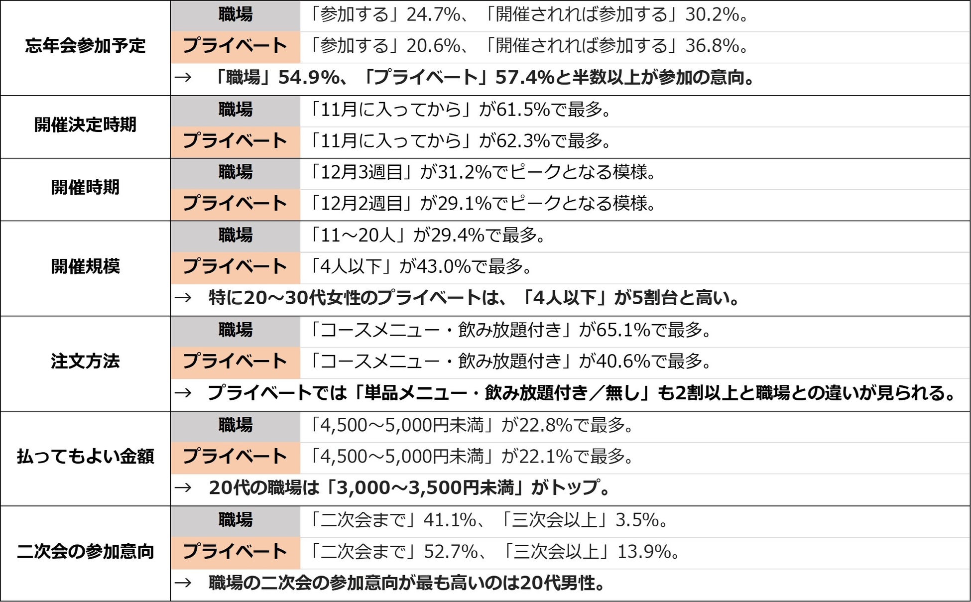 12月に入り、忘年会シーズンが本格化しました。今年の忘年会では、参加意向が半数を超えており、プライベートの忘年会のほうが参加意向がやや高い傾向が見られます。