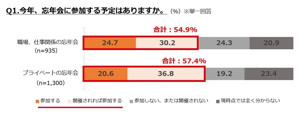 職場・プライベートともに半数以上が忘年会に参加の意向