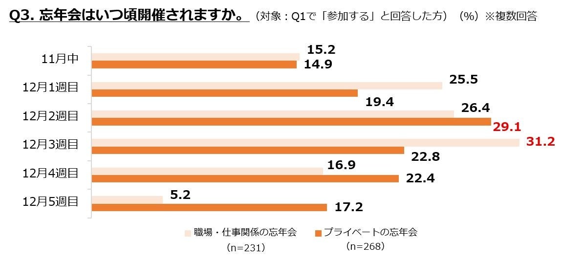 ところで、忘年会のピークは、職場で12月3週、プライベートで12月2週となるようです。一番忘年会が盛り上がる時期にワイワイ楽しむのもよいですが、少しでもゆったりと忘年会を楽しみたい方はこの12月2週、3週を避けて予定を立てていただくと良いかもしれません。
