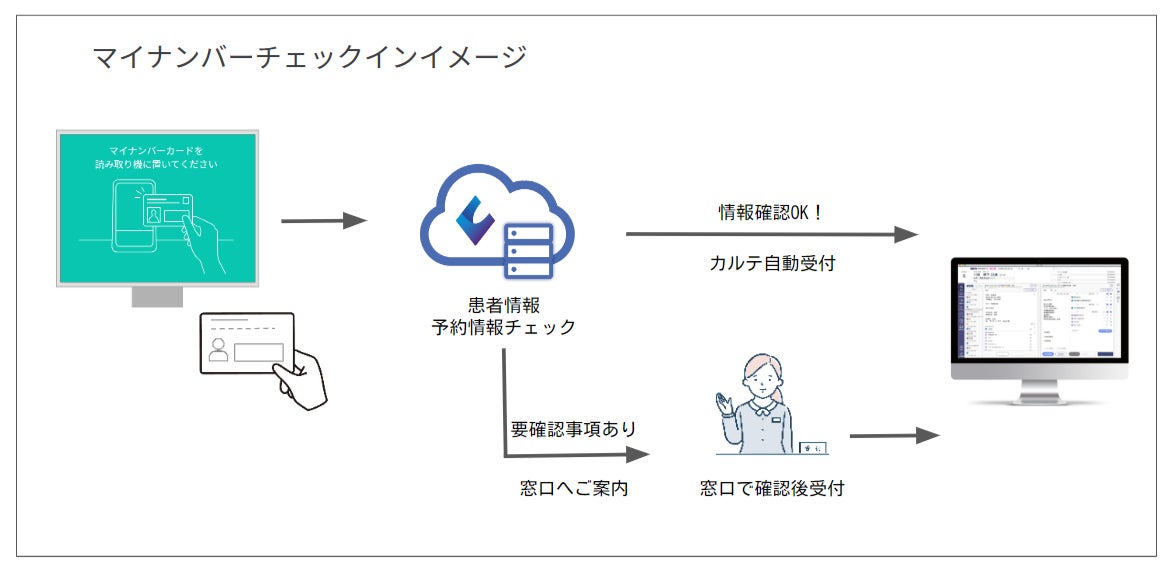 従来のクリニックにおける受付業務は、患者さまから保険証を預かり目視確認の後、手動でカルテを操作して患者検索と受付の作業が必要でしたが、本システムを導入すれば患者さまご自身にマイナンバーカードをカードリーダーにかざしていただくだけで、患者情報の取得から受付まで全ての受付業務を自動で行うことができます。
