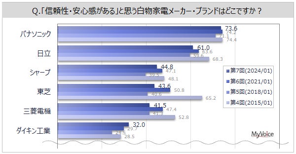 信頼性・安心感があると思う白物家電メーカーは(複数回答)、「パナソニック」が73.6%、「日立」が61.0%、「シャープ」「東芝」「三菱電機」が各40%台です。