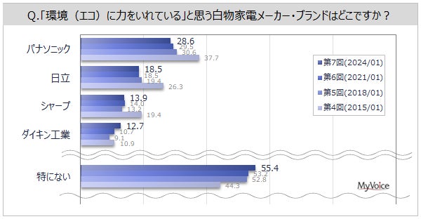環境(エコ)に力を入れていると思う白物家電メーカーは(複数回答)、「パナソニック」が28.6%、「日立」が18.5%、「シャープ」「ダイキン工業」「三菱電機」が各1割強です。「特にない」が55.4%と高くなっています。