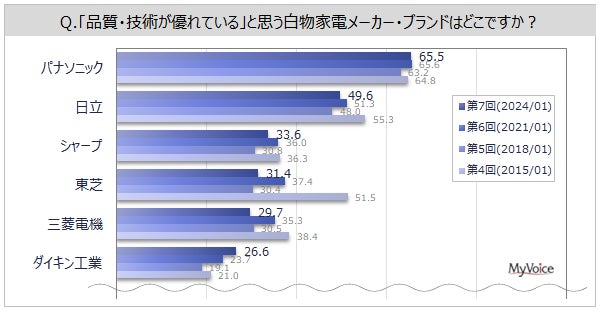 品質・技術が優れていると思う白物家電メーカーは(複数回答)、「パナソニック」が65.5%、「日立」が49.6%、「シャープ」「東芝」が各3割強となっています。