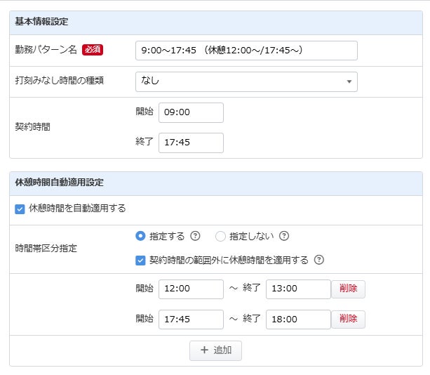 2.「契約時間の範囲外に休憩時間を適用する」を有効にし、時間区分を指定します。