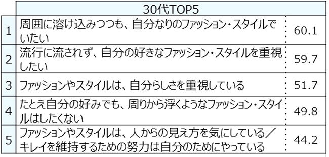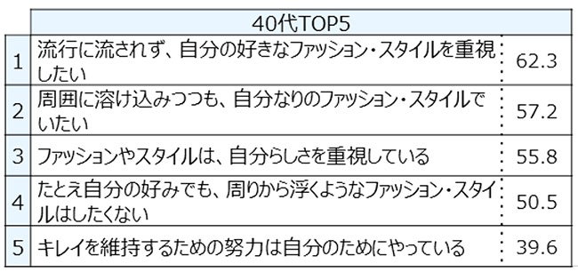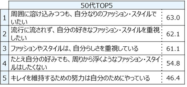 ■「美容・ファッション」に関して「周囲に溶け込みつつも、自分なりのファッション・スタイルでいたい」が30代と50代でトップ。20代と40代では2位に。