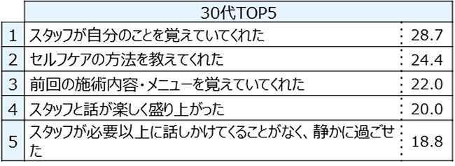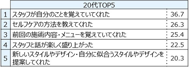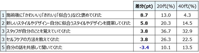 年代別差分では20代は「施術後に「かわいい」「きれい」「似合う」などとほめてくれた」の数値が高い。