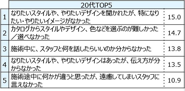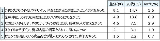 また、「サロンで困ったこと」では、20代は40代に比べ「スタイルやデザイン、色などを選ぶのが難しかった」との回答が高くなりました。経験値の少なさから選択が難しい、という理由もあるかと思いますが、フリーアンサーから、「時間がかかることで申し訳ない」といった“空気をよむ”傾向も見られました。周りからの見られ方が気になるがゆえになかなか言葉に出したり、主張が難しいからこそ、サロン側から気持ちを汲み取りサポートをすることで、満足度が向上していくのではないでしょうか。