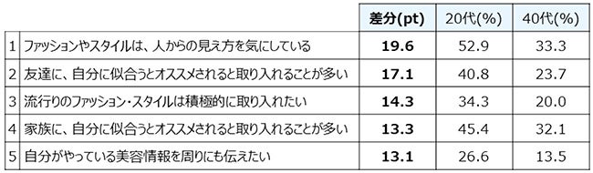 <20代と40代で差分が大きかったTOP5>