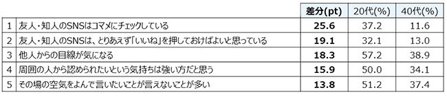 40代と20代の比較で差分が大きかったのは「周囲に認められたい」「言いたいことが言えない」。