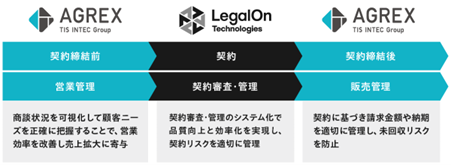 両社は、第一弾として、契約業務の最適化・効率化を支援する「契約業務バックオフィス支援サービス」(以下 本サービス)の提供を開始しました。LegalOn TechnologiesのAI契約審査プラットフォーム「LegalForce」とAI契約管理システム「LegalForceキャビネ」の導入で、契約前後に発生する審査や契約管理のリスクを低減することに加え、アグレックスの最新技術を活用した周辺業務および社内文書のデジタル化や、CRM・SFA等の企業活動に不可欠な顧客管理システムの導入、請求管理などを行うことで、「営業管理」「契約審査・管理」「販売管理」全体の改善・効率化を実現します。