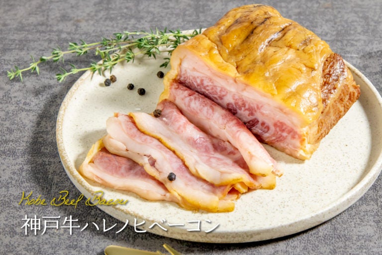 美味しさは、脂身で決まると言われるベーコンには、希少価値が高く和牛の中でも最高級の肉質を誇る「神戸牛」のバラ肉を使用しました。岩塩やこだわりのスパイスを使用し、プロ仕込みのマリネ製法で数日間漬け込んでから、はちみつを塗って燻製したベーコンは、薫り高いスモークの風味と上質な脂の旨味が、口に入れた瞬間に舌の上で溶け出します。