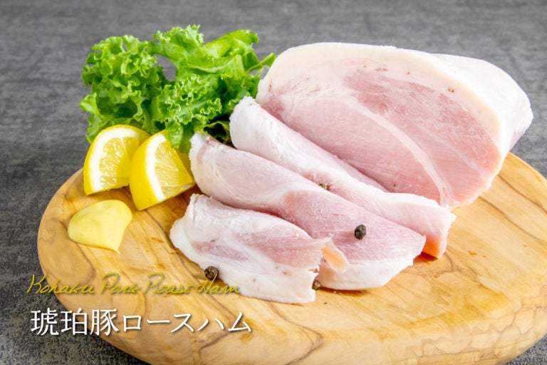 市場には出回っておらず希少価値の高い「琥珀豚」を使用したオリジナルロースハムは、宝石のように光るロースの肉質と上品な脂の甘み、濃厚な味わいを兼ね備えています。三田有馬の大自然を享受し、大切に育てられた「琥珀豚」は、上質な糖分がたっぷり含まれているため、上品な甘みを贅沢に感じることができます
