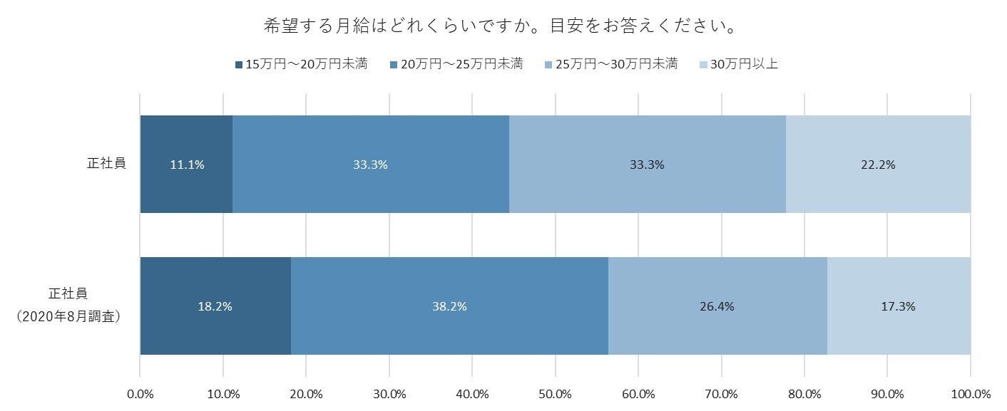 「正社員」を希望する人では、「20万円~25万円未満」と「25万円~30万円未満」が33.3%、「30万円以上」が22.2%だった。2020年8月調査と比較すると、「25万円~30万円未満」は6.9pt、「30万円以上」は4.9pt増加し、25万円以上を希望する割合が増えて半数以上になった。