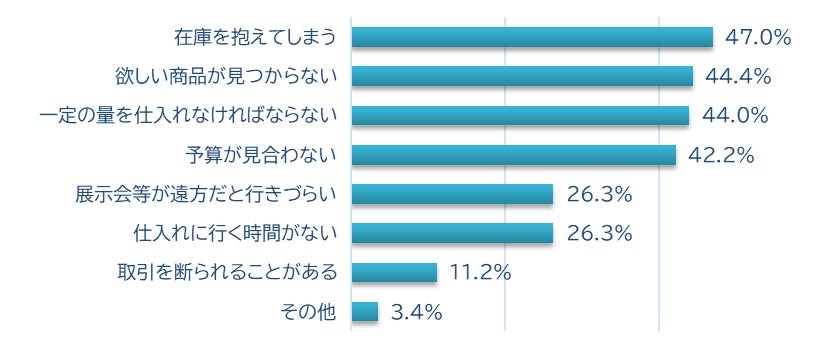 ・仕入れに関して半数以上(53.8%)が課題を感じており、特に「在庫を抱えてしまう」「欲しい商品が見つからない」「一定の量を仕入れなければならない」といった理由が多い。