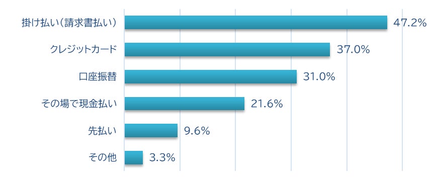 企業間取引において欠かせない「決済」においては、現在利用している決済方法と希望の決済方法に大きな差異はなく、従来からニーズの高い「掛け払い(請求書払い)」が大きな割合を占めています。