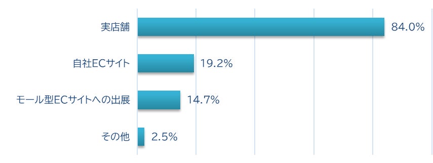 今回の回答者のお店の業態は実店舗が最も多く全体の8割超、その他自社ECサイト19.2%、モール型ECサイトへの出展14.7%、その他2.5%となっています。