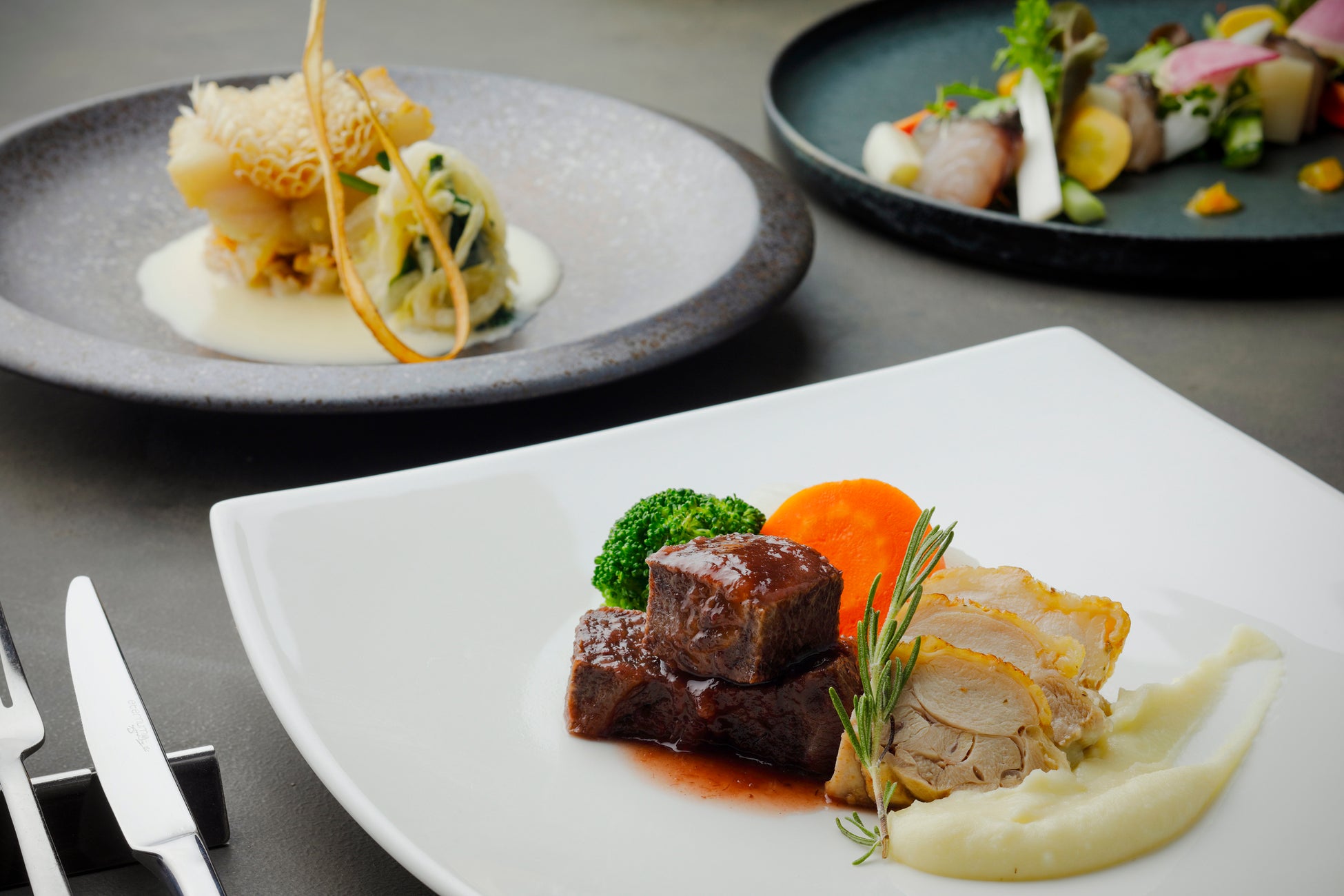 国産牛ホホ肉の赤ワイン煮込みと近江鶏の低温調理