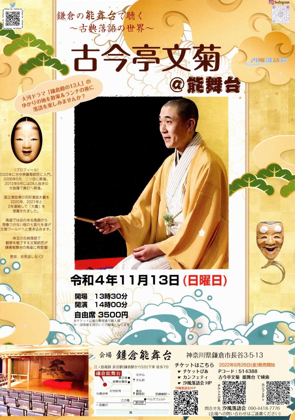 汐風落語会『古今亭文菊@能舞台』が2022年11月13日(日)に鎌倉能舞台(神奈川県鎌倉市)にて開催されます。チケットはカンフェティ(運営:ロングランプランニング株式会社、東京都新宿区、代表取締役:榑松 ⼤剛)にて8月26日(金)より発売開始です。
