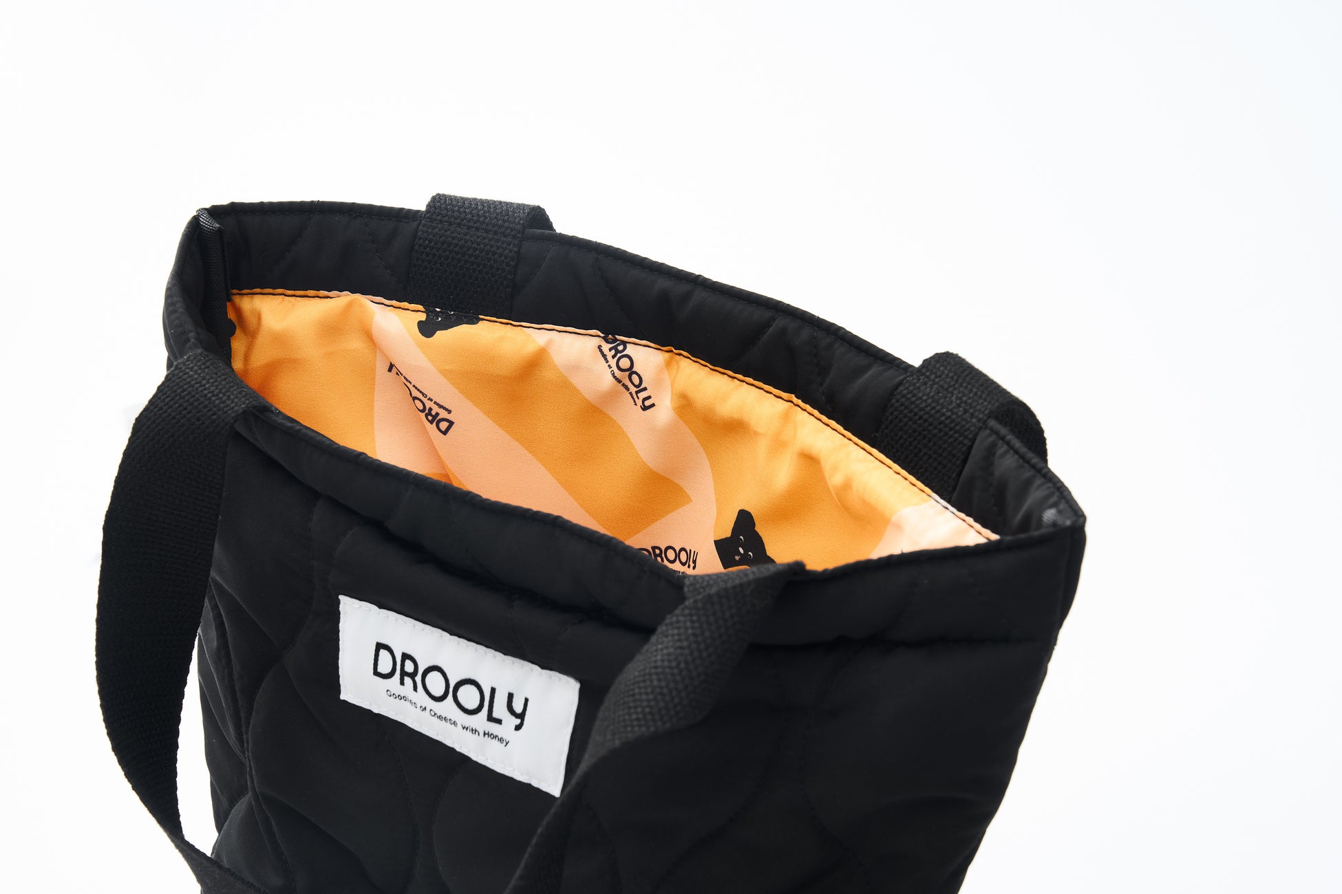 幅広いシーンに対応可能なキルト生地で仕立てた黒いトートバッグ。内側はイメージカラーであるオレンジ生地。ひょっこりドローリーが中から覗く、遊び心あるトートバッグが完成いたしました!無くなり次第終了となりますので、お早めにお越しくださいませ。
