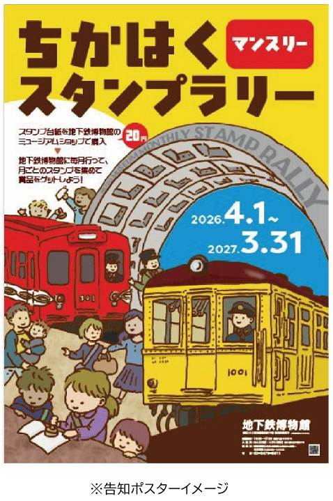 東京地下鉄株式会社(本社:東京都台東区、代表取締役社長:小坂 彰洋、以下「東京メトロ」)は、公益財団法人メトロ文化財団(東京都千代田区、会長:本田 勝)が運営する地下鉄博物館において、2026年4月1日(水)~2027年3月31日(水)にかけて実施する「ちかはくマンスリースタンプラリー」に協力いたします。