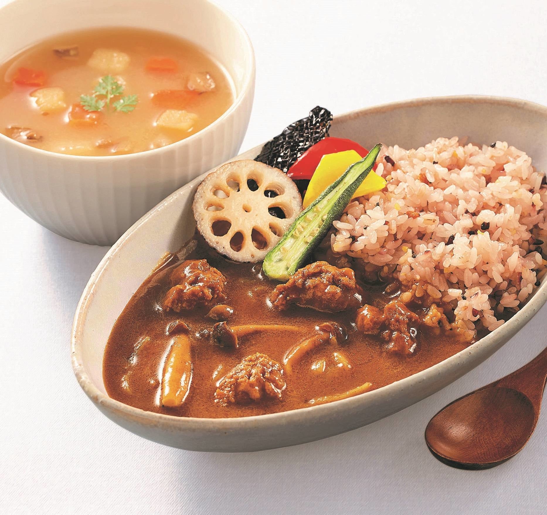 規格外野菜を伝統的な料理技法「重ね煮」でうまみを引き出した野菜スープ、小麦粉などアレルゲン28品目不使用のカレーと、大豆プロテインミートをセットにしました。