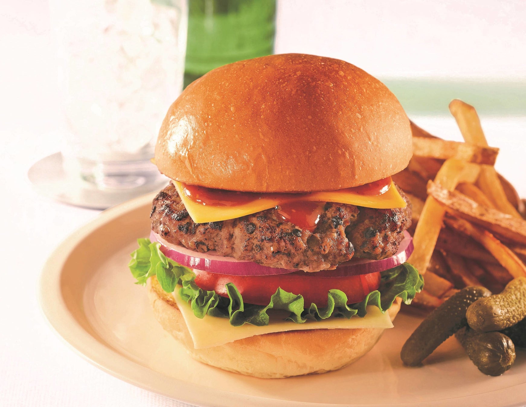 おいしさの秘密は、独自プログラムで育てた4Xビーフ100%パテ。チェダーとゴーダのとろけるWチーズ、マスタード入りBBQソースがパテとも好相性。お好みの野菜を挟んで作るリッチなハンバーガーです。