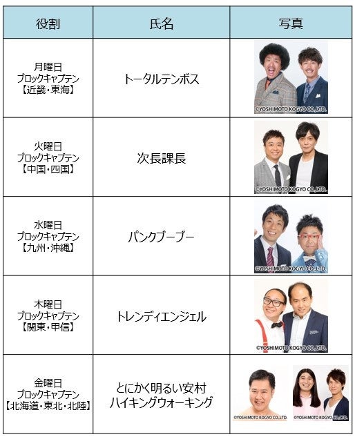 ブロックキャプテン 月曜 トータルテンボス 火曜 次長課長 水曜 パンクブーブー