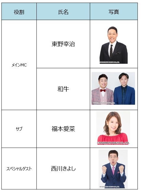 当日のメインMCは、東野幸治、和牛が担当し、スペシャルゲストとして西川きよしが出演します。そして、 全国を曜日ごと5ブロックに分けてお送りする「Cheeky’s a GoGo!」各曜日のレギュラー出演者となる、 トータルテンボス、次長課長、パンクブーブー、トレンディエンジェル、とにかく明るい安村、ハイキングウォーキングらが