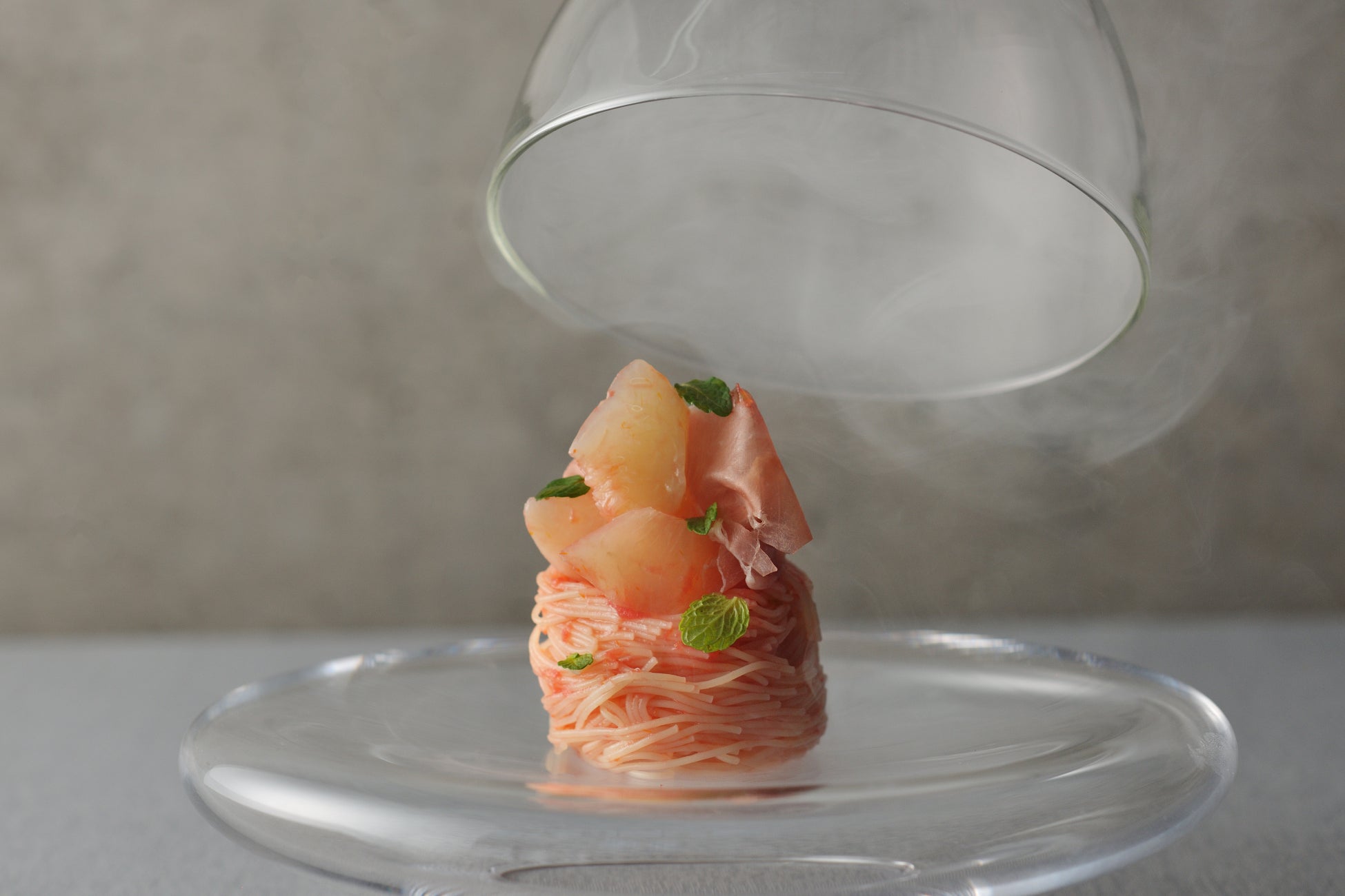 トマトの甘みや繊細さを引き出したソースを、桃とカペッリーニ(*1)に合わせた暑い夏にぴったりな冷製パスタです。桃の瑞々しく優しい甘さが、トマトの味わいを引き立てます。ミントの清涼感と生ハムの塩味がアクセントに加わった、山梨の夏らしい爽やかな一皿です。