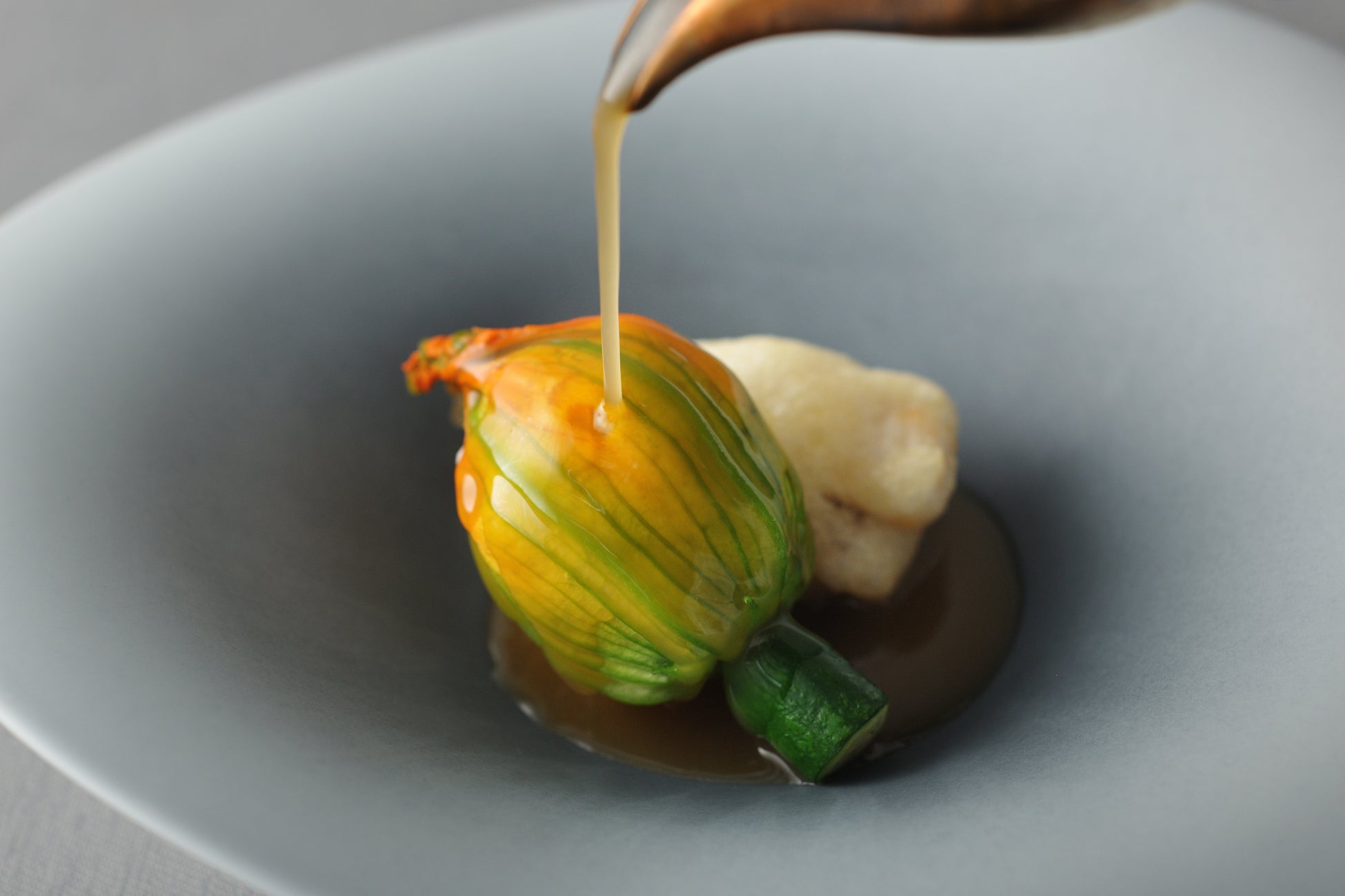 夏に旬を迎える花ズッキーニでイワナを包み、ふっくらと蒸し上げました。香ばしくフリットにしたイワナと合わせて提供するので食感の違いを楽しめます。仕上げに注がれた川海老の出汁がイワナの旨味を引き立てます。