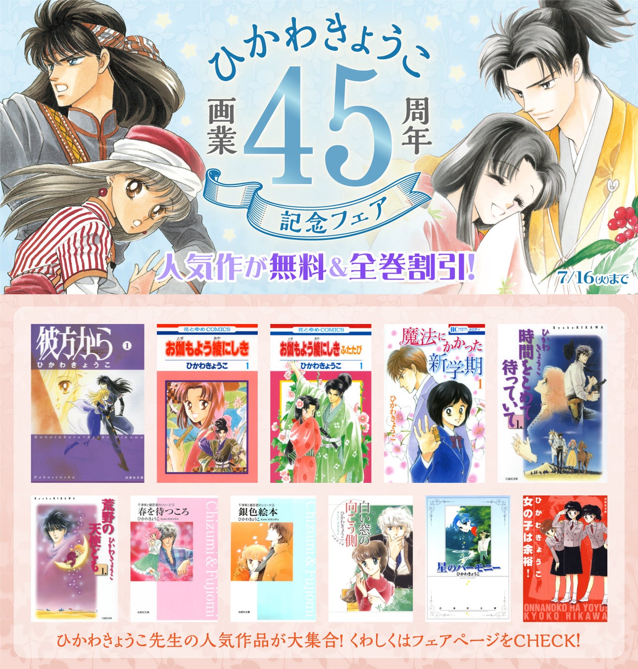 「彼方から」「お伽もよう綾にしき」「千津美と藤臣君シリーズ」など人気作が無料&全巻割引! ひかわきょうこ画業45周年記念フェア開催!