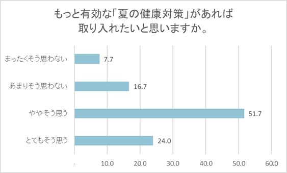 その背景には、気候や生活環境の変化などにより、年間を通じて体調管理への配慮が必要とされる状況が続いていることが挙げられます。なかでも、2025年6月〜8月の全国平均気温は、1898年の統計開始以来最高を記録し、例年にない厳しい暑さが続きました。猛暑で知られる埼玉県熊谷市で実施した「猛暑の健康対策に関する調査※3」では、約5割の方が夏場の体調に不安を感じていることに加え、約7割の方が「有効な夏の健康対策を取り入れたい」と考えていることが明らかになっています。