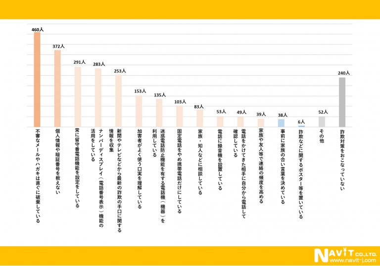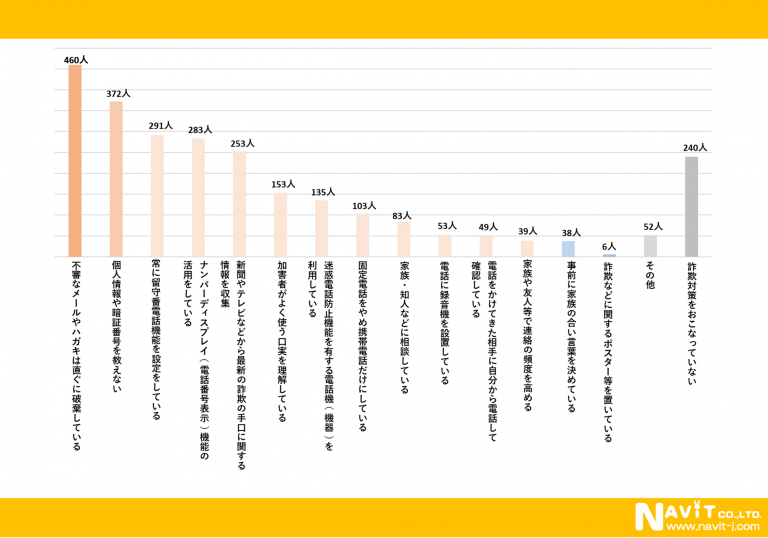 「どのような詐欺対策をおこなっていますか?」という質問については、「不審なメールやハガキは直ぐに破棄している」が460人、「個人情報や暗証番号を教えない」が372人、「常に留守番電話機能を設定している」が291人という順になりました。