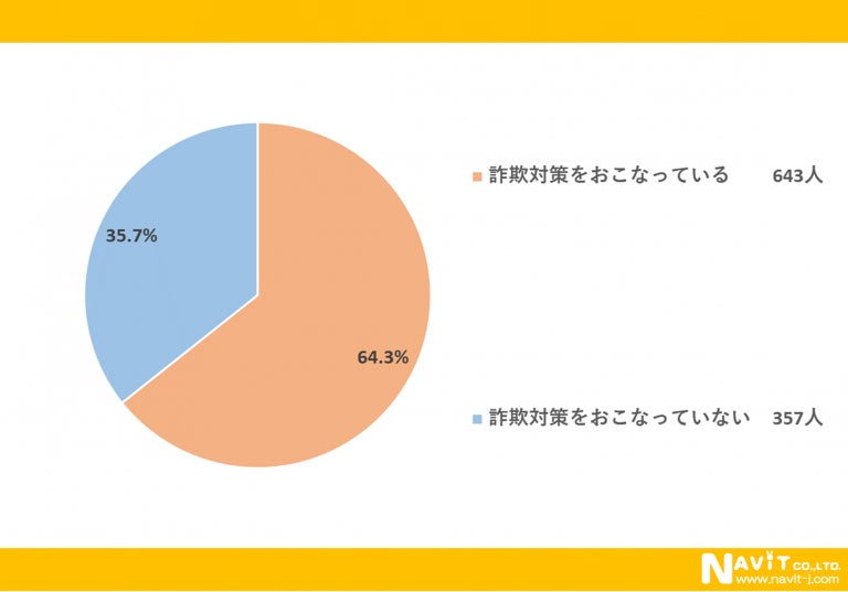 「詐欺対策をおこなっていますか?」の質問については、「詐欺対策をおこなっている」が64.3%、「詐欺対策をおこなっていない」が35.7%という結果になり、6割以上の人が詐欺対策をおこなっていることが分かりました。