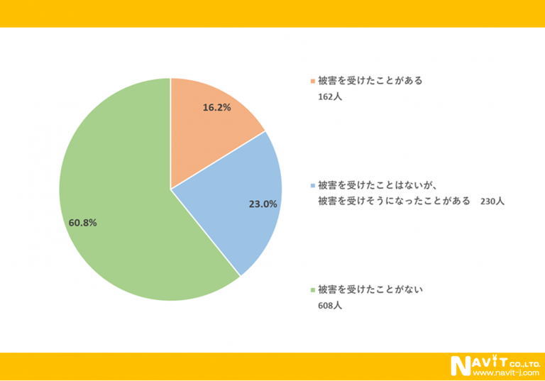 「詐欺の被害を受けたことまたは、受けそうになったことがありますか?」という質問については、「被害を受けたことがある」が16.2%、「被害を受けたことはないが、被害を受けそうになったことがある」が23.0%と、合わせると39.2%の方が被害を受けた・受けそうになったことがあると分かりました。