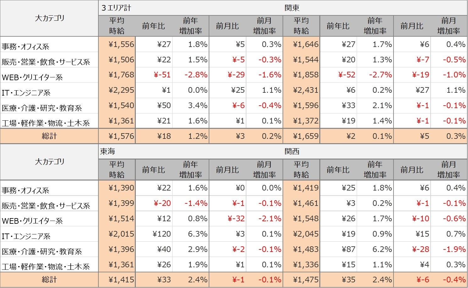 各エリアの平均時給について、関東エリアは1,659円(前年比2円増、前月比5円増)、東海エリアは1,415円(前年比33円増、前月比1円減)、関西エリアは1,475円(前年比35円増、前月比6円減)となりました。