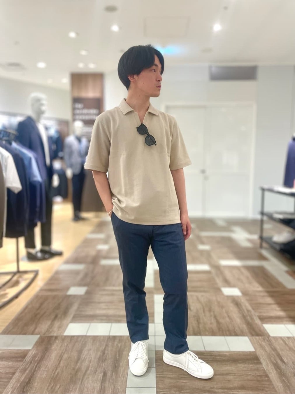 スキッパーポロシャツを使った、休日のお買い物スタイル。リラックス感がありながらも、夏らしい爽やかさを意識したコーディネートです。パンツはストレッチが効いていて動きやすく、麻混素材で見た目も涼しげ。ポロシャツには吸水速乾機能が備わっており、汗ばむ季節でも快適に過ごせます。シンプルな組み合わせなので、サングラスなどの小物をプラスして、さりげないこなれ感を演出するのがおすすめです。