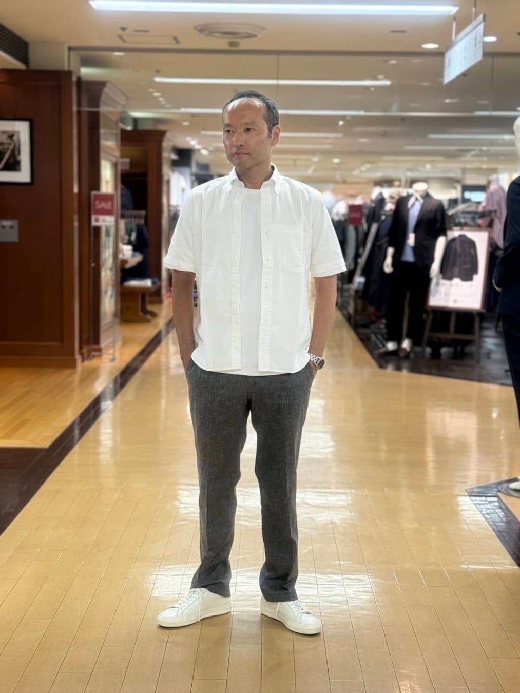 散歩やカフェ、ショッピングなど、休日の街歩きにぴったりな夏スタイル。チェック×無地のコンビシャツは、派手すぎず程よくアクセントに。白Tをインナーに合わせることで、軽さと清潔感をプラスしました。グレーパンツでラフさを引き締めつつ、白スニーカーで爽やかに。見た目も着心地も大切にしたい大人におすすめのコーデです。