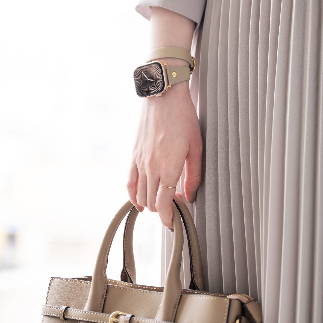 細めのベルトが作り出す華奢なラインと、ゴールドのパーツの華やかさが、手首を美しく表現してくれます。