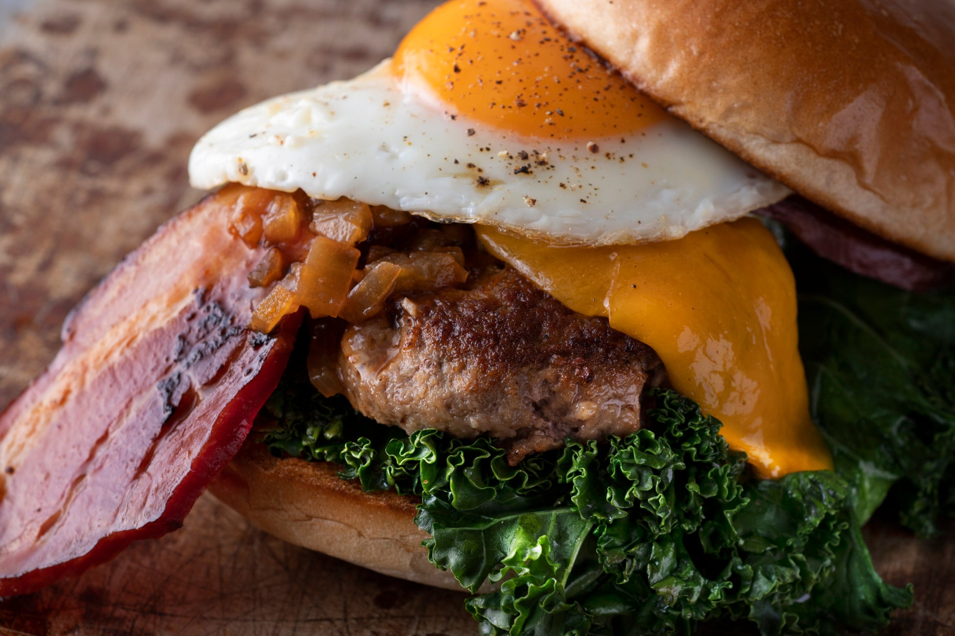 厚切りベーコンとパティが同時に味わえるお肉好きのための食べ応えのあるバーガー。フライドエッグのとろける黄身やスモークBBQソースが合わさり癖になる味わいに。