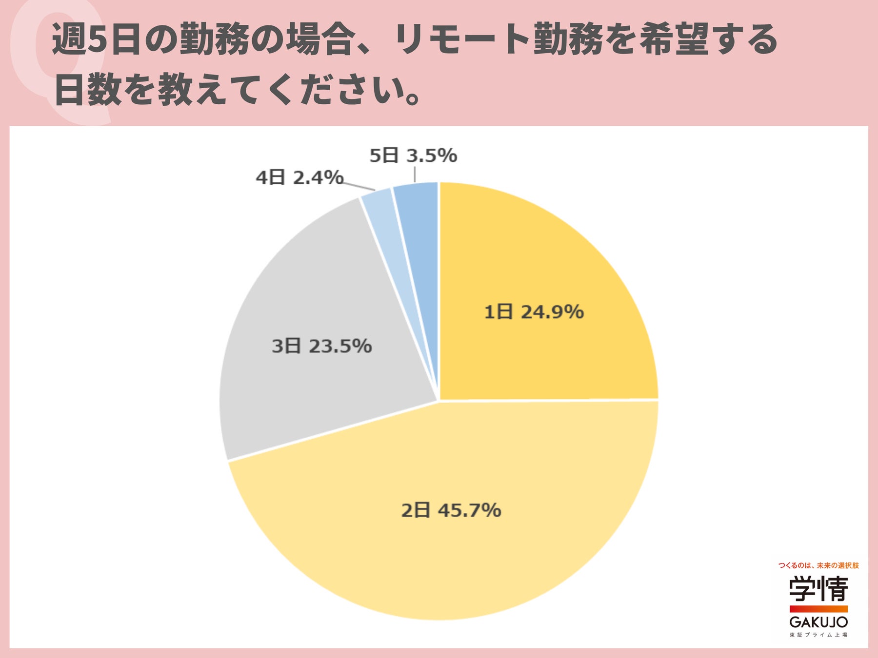 では、リモート勤務は週に何日がいいのでしょう。「週5日勤務の場合、リモート勤務を希望する日数」を聞いたところ、半数近い45.7%の学生が「2日」を選びました。次いで「1日」24.9%、「3日」23.5%が続きました。「それぞれ半分くらいが働きやすい」「リモートの日数があまり多くても仕事に集中できないと感じる。2日ぐらいがちょうどいい」といった声が上がっています。