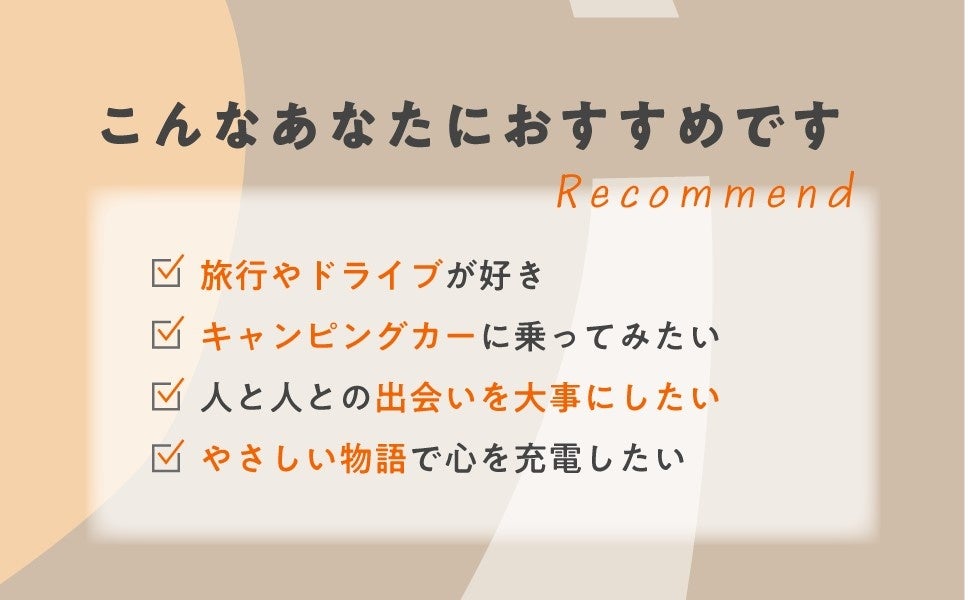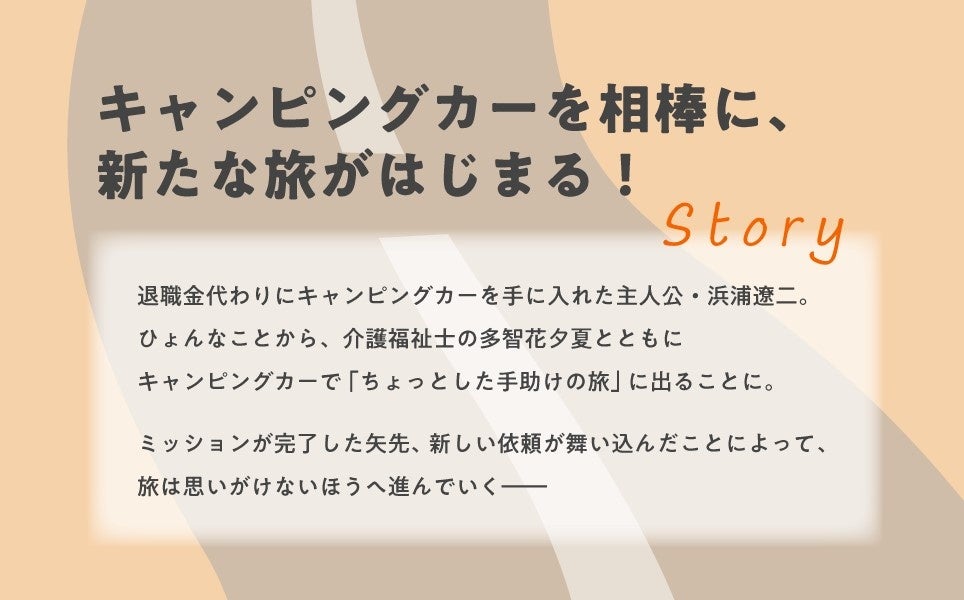 勤務先の運送会社が倒産し、退職金代わりにキャンピングカーを手に入れた主人公・浜浦遼二。困っている老婦人に手を差し伸べたことをきっかけに、介護福祉士の多智花夕夏とともに「ちょっとした手助けの旅」に出ることに。