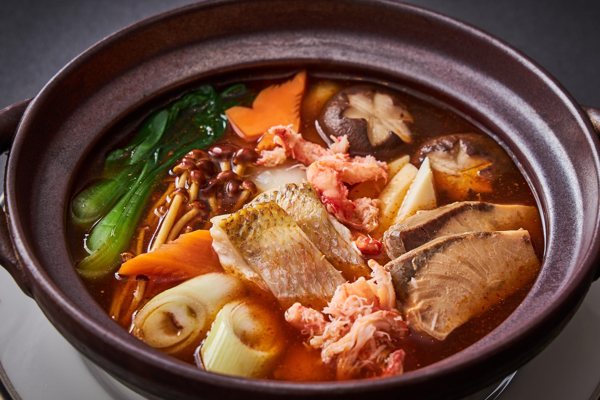 のどぐろ、鰤、ずわい蟹などの北陸産の海の幸を辛みの効いた豆板醤のスープで煮込んだ一品です。季節の野菜の旨みと北陸の滋味深き味わいの 鍋をご賞味ください。