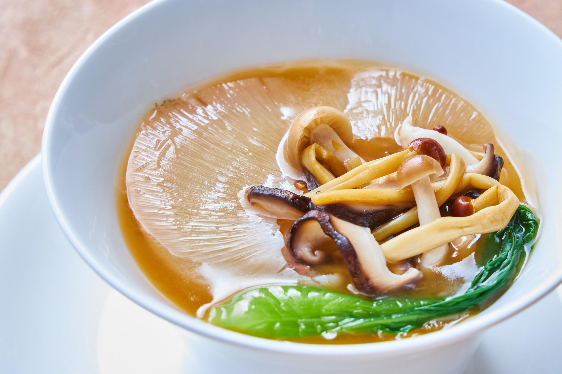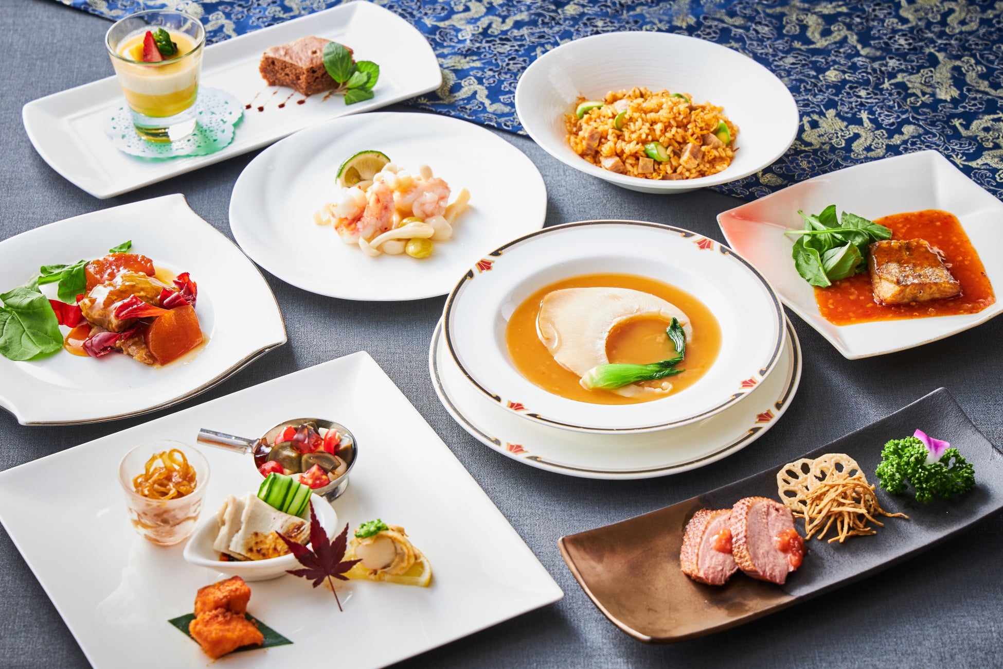 色とりどりの素材を使用した前菜五種盛り合わせから始まる満足度の高いディナーコースです。厚みのあるふかひれを贅沢に一枚使用した“コラーゲン入りふかひれ姿煮”では、「紅焼(ホンシャオ)」と呼ぶ、つややかなあめ色をした中国の伝統的な味付けであるとろみのついた醤油風味煮込みをご堪能ください。“海老と季節野菜入り 岩塩炒め かぼす添え”では、海老のプリプリとした食感と秋を感じるきのこや銀杏を使用し、素材の味を引き立てた一品に仕上げました。さらに料理長が得意とするフルーツの甘みを利用し、辛さだけではない旨みが増幅される調理法で仕上げた“和牛と柿 四川唐辛子炒め”をお楽しみいただけます。お食事は2種類からお選びいただけ、中でも豆板醤や山椒が効いた深みある味わいの“四川炒飯”がおすすめです。