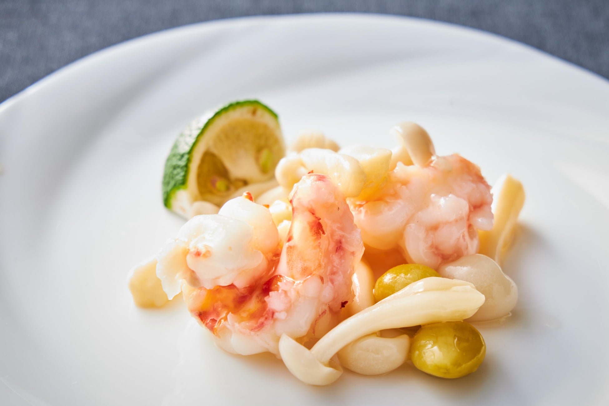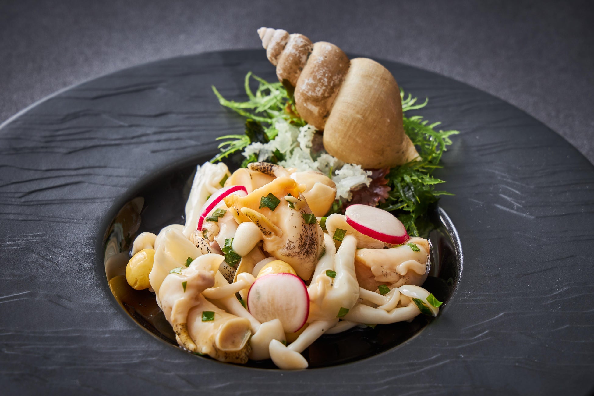 広く地元の人に親しまれている「バイ貝」を生銀杏と白しめじと一緒に炒めました。独特のこりこりっとした食感をお楽しみいただきながら、大葉をベースとした爽やかな香草ソースがよく絡み、食欲が増幅する一品です。