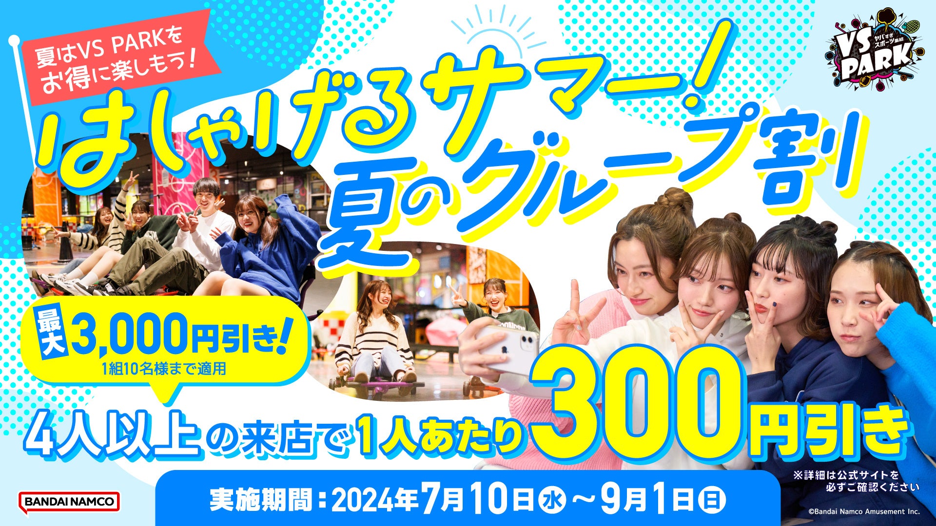 株式会社バンダイナムコアミューズメントが運営する屋内”ヤバすぎ”アクティビティ施設『VS PARK』では、2024年7月10日(水)から9月1日(日)までの期間、4人以上のご来店でお得に遊べる「はしゃげるサマー!夏のグループ割」を実施します。1組4人以上でVS PARKに来店すると120分料金が1人あたり300円引きで遊ぶことができ、最大3,000円もお得になります!